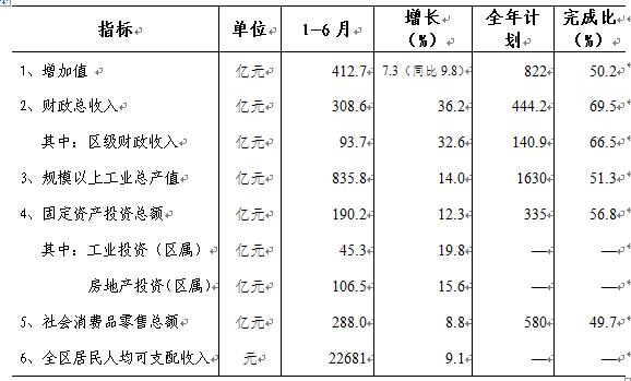 上半年我区实现增加值412.7亿元,可比增长7.3%(同比增长9.8%)。其中,第一产业实现增加值2.9亿元,可比下降39.0%;第二产业实现增加值225.4亿元,可比增长9.9%,其中工业实现增加值207.0亿元,可比增长10.4%,比第二产业总体高出0.5个百分点;第三产业实现增加值184.4亿元,可比增长5.5%。三次产业结构比重为0.7:54.6:44.7,其中第一产业比重比上年下降0.5个百分点,第二产业比重上升1.0个百分点,第三产业比重下降0.5个百分点。