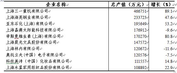 从生产基本面来看,32个行业大类中23个行业实现正增长,增长面达71.9%,增幅两位数以上的有13个行业,反映我区工业经济走势向好。在全行业中产值占比前三的行业依次为化学原料和化学制品制造业、电气机械和器材制造业和汽车制造业,其工业产值增速分别为28.1%、-6.9%、30.8%。化学原料和化学制品制造业增幅较上年同期提高了27.1个百分点,汽车制造业增幅较上年同期增加了17.9个百分点。其他占比较高的行业还有专用设备制造业、通用设备制造业和医药制造业,分别实现产值84.3亿元、71.1亿元和65,0亿元,同比增长45.3%、11.8%和27.8%。从产销情况来看,1-6月完成规模以上工业销售产值834.0亿元,同比增长14.7%,工业产销率为99.8%,较上年同期增加0.6个百分点。从百强企业情况来看,1-6月我区百强企业完成工业总产值490.0亿元,同比增长24.3%,高于全区平均水平10.3个百分点,占全区规模以上工业总产值的比重为58.6%。百强企业中增幅排名前十的企业情况如下: