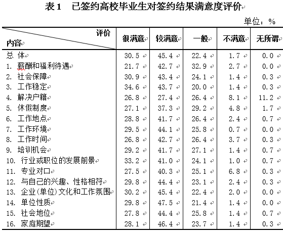 调查显示,分别有30.5%和45.4%的已签约毕业生对签约结果总体“很满意”或“较满意”(见表1)。具体来看,已签约毕业生对“工作稳定”、“单位性质”“企业(单位)文化和工作氛围”表示“很满意”或“较满意”的比重最高,分别达78.3%、77.3%和75.6%;对“工作时间(69.5%)”、“专业对口(67.8%)”“休假制度(64.4%)”、“薪酬和福利待遇(64.4%)”和“解决户口(54.2%)”的满意度偏低;对其他的“行业或职位的发展前景”、“社会保障”、“与自己的兴趣、性格相符”、“工作地点”等8个方面的满意度均在70.0%以上。