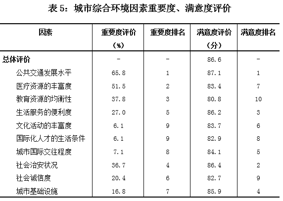 企业最满意的因素是公共交通发展水平、社会治安状况和生活服务的便利度,满意度评价分别为87.1分、86.4分和86.2分;企业满意度最低的因素是教育资源的均衡性,满意度评价为80.8分(见表5)。