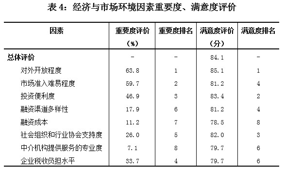 企业最满意的因素是对外开放程度、投资便利度、社会组织和行业协会支持度,满意度评价分别为85.1分、83.4分、82.0分;企业满意度最低的因素是融资成本,满意度评价为78.5分(见表4)。