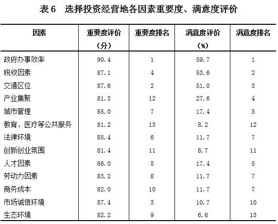 (六)企业选择投资经营地,最看重政府办事效率,但满意度不高