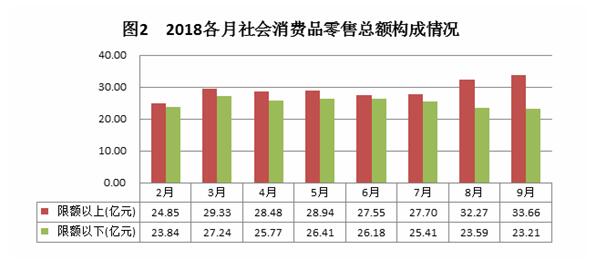 数据显示:自2017年以来,我区社会消费品零售总额增幅持续低位,至2018年9月,全区实现社会消费品零售总额497.53亿元,增长1.7%。其中,批发和零售业实现社会消费品零售总额451.99亿元,下降0.3%,住宿和餐饮业实现45.54亿元,增长27.1%。从社会消费品零售总额的结构看,限额以上企业实现零售额291.06亿元,与去年同期持平;限额以下实现零售额206.47亿元,增长4.3%,主要是因为市场关闭等因素影响了限额以下零售额增速。(如图2所示)