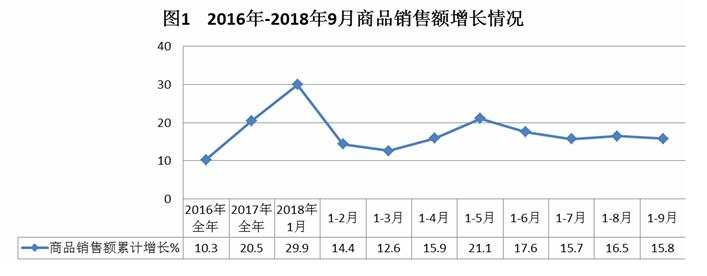 从总量和增长看,受“互联网+”大宗商品交易平台的影响,自2016年以来,我区的商品销售额持续保持较快的增长速度。1-9月实现商品销售额3687.52亿元,增长15.8%。其中限额以上实现2603.88亿元,增长23.7%,金属及金属矿批发实现2602.43亿元,增长18.5%,通过互联网实现的销售额1218.09亿元,增长23.4%。(如图1所示)