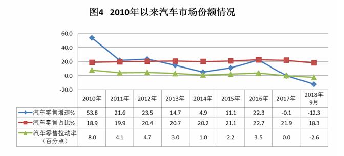 从汽车零售对社会消费品零售总额的占比看,自2010年以来,我区汽车市场进入快速发展时期,占比不断提高,至2016年,达到22.7%,2017年受各种政策以及我区汽车市场品牌布局等因素的影响,汽车零售出现首次下滑。从汽车市场对社会消费品零售总额的贡献看,2010年贡献率达到37.7%,拉动当年社会消费品零售总额8个百分点,至2018年9月,汽车零售拖累全区社会消费品零售总额增长2.6个百分点。(如图4所示)