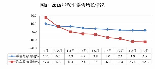 今年以来,全区汽车市场持续受到“车牌限制”、购置税上调、店面拆违等因素的影响,车市交易总体低迷。1-9月全区51家汽车4S店实现零售额90.97亿元,下降12.3%。从增长趋势看,汽车零售自年初增长17.4%开始就逐月下滑,至3月持平,随后不断探底,至9月底,下降幅度达到12.3%,降幅自2007年以来最低。(如图3所示)