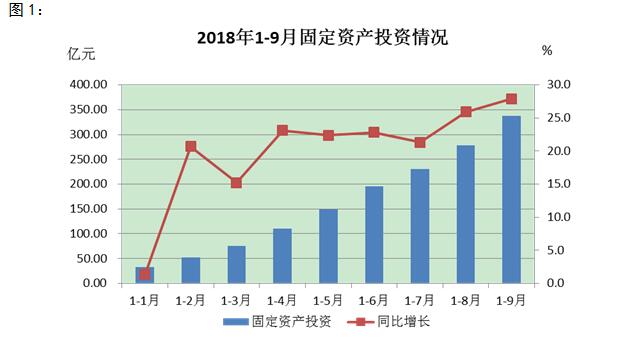 1-9月,全区固定资产投资项目412个, 比去年同期增长24.5%,完成固定资产投资338.02亿元, 比去年同期增长27.9%。其中新开工项目124个,比去年同期增长25.3%;完成固定资产投资67.76亿元,比去年同期增长58.6%。从1-9月各月投资累计增幅来看,除1月和3月外,其他月份增幅都在20%以上。(见图1)