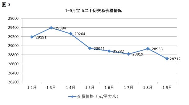 据区房产交易中心的数据显示:1-9月全区二手房交易面积96.50万平方米,同比增长4.6%;交易金额277.07亿元,同比增长10.6%。从各月二手房交易价格走势看总体呈现回落走势,1-3月交易价格29394元/平方米后均价小幅下降,其余各月价格相对保持平稳。(见图3)