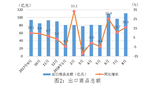 1-8月,全区出口商品总额718.79亿元,同比增长7.2%,增幅比上半年回升2.4个百分点。外商投资项目对全区出口增长影响较大,1-8月,外商投资项目出口566.43亿元,增长8.1%,占全区出口的78.8%,外资项目对全区出口的增长贡献率达到88%。