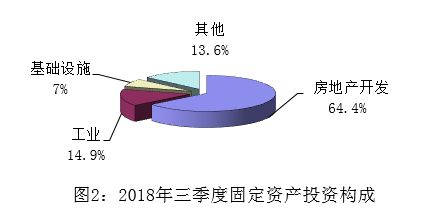 三季度,工业完成投资61.45亿元,同比增长35.7%,占全社会固定资产投资比重14.9%,比重较上年同期提高2.3个百分点;城市基础设施完成投资28.88亿元,同比下降12.2%,占比7%,比重较上年同期下降2.2个百分点;房地产开发完成投资264.89亿元,同比增长12.9%,占比64.4%,比重较上年同期下降0.9个百分点。(见图2)