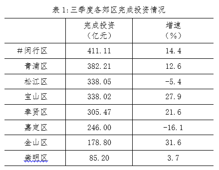 三季度,全区固定资产投资规模居全市郊区首位,增幅位列第四。(见表1)