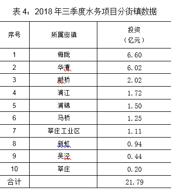 三季度水务项目共有40个,完成投资21.79亿元,占全区城市基础设施投资额的75.5%。从分街镇情况来看,梅陇镇、华漕镇、颛桥镇的水务投资额较大,合计完成投资14.64亿元,占全区水务投资的67.2%,主要是重污染河道整治工程项目(见表4)。