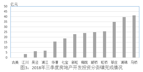 从分地区情况看,全区房地产投资分布不均,投资总量排前三位的是马桥镇、浦锦街道、莘庄镇,分别完成41.21亿元、39.57亿元、34.84亿元,投资额合计占全区房地产投资总量的43.6%。马桥镇和浦锦街道以住宅投资为主,完成投资18.15亿元和15.65亿元,分别占其房地产投资的44%和40%;莘庄镇以办公楼和商业营业用房投资为主,完成投资21.11亿元,占其房地产投资的60.6%。(见图3)