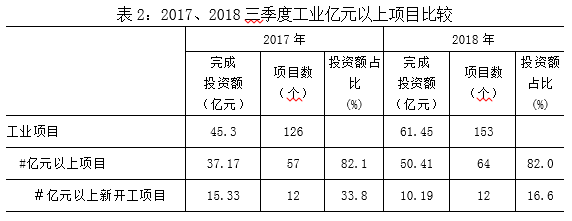 三季度,全区工业在建项目153个,比上年同期增加27个,完成投资61.45亿元,同比增长35.7%。工业亿元以上项目64个,比上年同期增加7个,完成投资50.41亿元,同比增长35.6%;亿元以上新开工项目12个,完成投资10.19亿元,同比下降33.5%。(见表2)