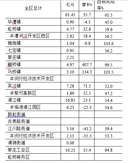 从分地区情况看,工业投资总量排前二位的是浦江镇和莘庄工业区,分别完成16.85亿元、16.21亿元,投资额合计占全区工业投资总量过半。(见表3)