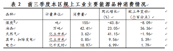 三季度,本区四大能源品种消费同比“三升一降”。除煤炭品种限制消费外,其他能源品种均有所上涨。油品类消费因为亚东石化其他石油制品消费增长同比上涨23.05%;天然气消费因为区两家发电公司发电量同比增长,拉动该品种同比上涨41.15%,但由于申能星火热电今年关闭,该品种增长幅度较上年收窄1.96个百分点;电力消费量作为主要能源品种,仍保持增长趋势,同比增长6.99%。