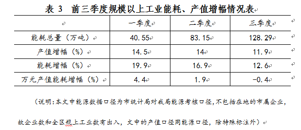 三季度规上工业能耗逐步趋于稳定且稳步下降,呈现相对较好的状况,一是能耗增幅逐季大幅下降,但仍高于产值增幅(此处产值指全部在地企业产值);二是万元产值能耗增幅由增转降。但是按照前三季度平均每月14.25万吨的能源消耗量来推算,要完成年度节能目标,还有相当大的压力,需要持续关注并加大节能降耗工作力度(见表3)。