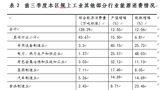 除高载能行业以外的其他行业综合能源消费量43.67万吨标煤,比去年同期上涨6.81%。其中,能耗总量增长较大的行业有:专用设备制造业主要受三一重机出口量以及内销需求增大的影响,能耗大幅上涨25.72%;电力、热力生产和供应业今年受电网调控发电量上涨带动能耗同比上涨48.03%;医药制造业因为生物制品研究所、帝斯曼维生素等企业去年调试运营,今年正常生产能耗同比上涨8.05%;有色金属冶炼和压延加工业因为海亮铜业大宗商品价格上涨,拉动行业能耗上涨11.13%;食品制造业因为去年惠广精细化工环评不合格停业,今年复产导致能耗上涨明显。(见表2)。
