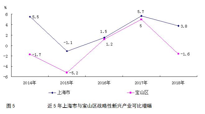 从近五年的占比和增速来看:宝山区战略性新兴产业发展质量也是在逐步提升。战略性新兴产业工业总产值占全区规模以上工业总产值比重由2015年的21.2%逐步提升到2018年的25.3%,提高4.1个百分点;增速由2015年触底反弹后逐年提升,至2018年调整回落,近5年年均可比增速为-0.5%。