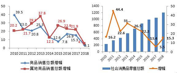 实体商业布局不断优化。盒马鲜生等新零售业态先后落地,中信泰富万达广场开业运营。全区实现社会消费品零售总额1203.6亿元,同比增长15.3%。其中,电子商务实现零售额753.7亿元,同比增长24.1%,拉动全区社会消费品零售额增长14.0个百分点,占全区零售总额的62.6%,比重较去年同期提高4.6个百分点。已开业经营的14个商业综合体和2条商业街区实现社会消费品零售额69.2亿元,同比增长28.1%,占全区零售总额的5.7%,比重较去年同期提高0.5个百分点。
