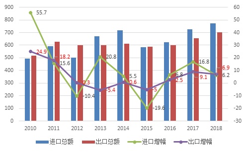 进出口增长幅度趋同。全年实现外贸进出口总额1472.8亿元人民币,同比增长6.6%。其中出口总额701.0亿元,同比增长6.9%;进口总额771.8亿元,同比增长6.2%。机电产品出口和进口额分别为451.9亿元和451.3亿元,同比均增长6.0%。按贸易方式分,一般贸易出口额490.6亿元,占出口总额的70.0%;加工贸易207.3亿元,占出口总额的29.6%;其他贸易3.2亿元,占出口总额的0.4%。按出口国别地区分,出口额位列首位的是北美洲,进口额位列首位的是欧盟。