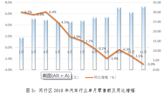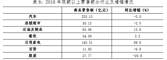 2018年,闵行区限额以上七大重点行业中,石油及制品、餐饮和日用家电同比增长,汽车、连锁超市、百货和服装行业同比出现了下降。其中汽车行业受到行业景气度的影响,同比增幅一路下滑,全年零售额同比下降了3个百分点。