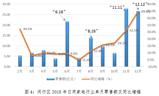 2、重点行业中日用家电行业情况。日用家电行业目前零售额增幅波动较大,各月度零售额总量和同比增幅容易受到互联网电商零售周期性促销活动的影响,尤其是“6.18”、“8.18”、“11.11”和 “12.12”四大年内电商促销活动,单月零售额较其他月份有明显提升(见图4)。