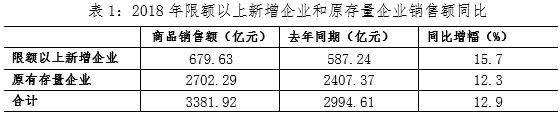 新增企业由于其较好的成长性,同比增幅通常略高于存量企业。而存量企业由于体量较大,其稳步增长对全区销售额增幅起到了较好的稳定作用。2018年, 全区限额以上新增企业共实现商品销售额679.63亿元,同比增长了15.7%,而存量企业则实现销售额2702.29亿元,同比增长了12.3%。