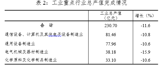 (2)四大重点行业产值均呈两位数下降 。1-2月,全区重点行业完成工业总产值230.70亿元,同比下降11.6%,而上年同期为增长6.6%。其中,电气机械及器材制造业降幅最大,达15.9%,其他三个重点行业降幅均在10%左右。