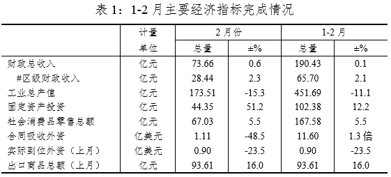 闵行区统计局 2019-04-041-2月,全区经济运行稳中趋缓,财政收入小幅增长,消费市场总体稳定,投资、出口增长较快,房产交易呈回暖迹象,但工业总产值下降幅度较大,具体情况如下: