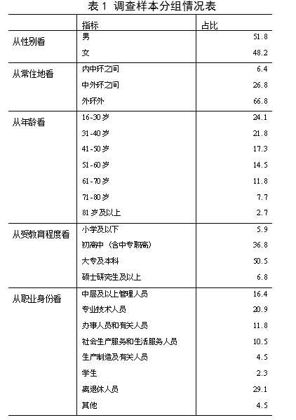 本次调查共收回有效问卷220份,对象全部为闵行常住居民。参与此次电话调查的样本主要有以下几个特征:年纪轻,中青年占比77.7%;学历高,大专及本科以上占比57.3%;居住地多在外环外,占比66.8%;职业身份多为离退休人员人员、专业技术人员和中层及以上管理人员(见表1)。
