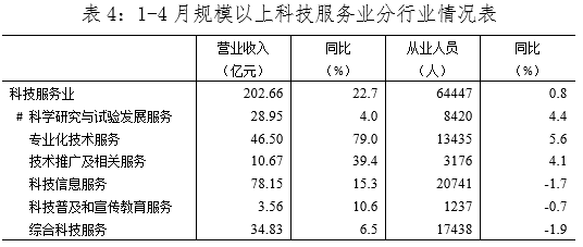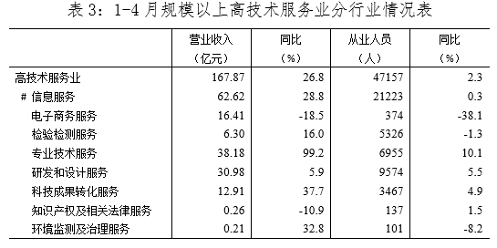 截至4月,全区规模以上高技术服务业企业数为275家,前4个月合计完成营业收入167.87亿元,同比增长26.8%,增幅较上年同期高出10.0个百分点。从趋势看,1-2月增幅为27.5%,1-3月增幅为32.1%,且始终在上年同期趋势上方运行,增长势头强劲。从行业看,专业技术服务增长最快,完成营业收入38.18亿元,同比增长99.2%,科技成果转化服务、信息服务和检验检测服务等比重较大的行业也有不俗表现,增幅分别为37.7%、28.8%和16.0%。盈利能力最好的行业是环境监测及治理服务和信息服务,实现利润总额分别为556万元和39430万元,同比增长1.5倍和1.3倍。其中,电子商务服务主要受2家大企业业绩下滑因素影响,出现下降,营业收入同比下降18.5%,从业人员同比下降38.1%(见表3)。