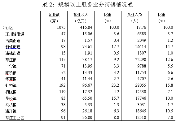 从地区看,虹桥是全区服务业所占比重最大的街镇,前4个月完成营业收入96.67亿元,约占全区比重的四分之一,从业人员2.8万人,约占全区比重的七分之一。此外,新虹和吴泾也是服务业集聚度较高并快速发展的街镇,营业收入分别占17.7%和15.7%,从业人员分别占14.7%和10.0%。古美街道、浦锦街道和马桥镇服务业规模相对较小(见表2)。