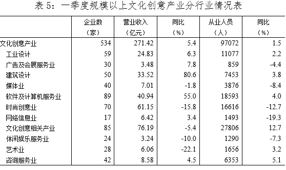 从国家标准(注1)的口径看,截至一季度末,全区规模以上文化及相关产业企业数为313家,前3个月合计完成营业收入103.89亿元,同比增长3.3%。从上海标准(注2)的口径看,同期全区规模以上文化创意产业企业数为534家,合计完成营业收入271.42亿元,同比增长5.4%,比国家口径高出2.1个百分点,值得注意的是虽然营业收入的增幅较上年同期下滑了0.9个百分点,但从业人员数没有下降,3月末从业人员数为9.7万人,同比增长1.5%。从行业看,软件及计算机服务业和建筑设计发展较好,分别完成营业收入40.94亿元和33.52亿元,同比增长55.0%和80.6%,从业人员同步增加,发展趋势进一步看好;时尚创意业、媒体业和休闲娱乐服务业同比下降,营业收入分别下降15.8%、1.8%和10.0%,从业人员分别下降12.7%、8.4%和7.3%(见表5)。从排名前30的企业看,合计营业收入171.15亿元,同比增长8.1%,合计从业人员4.4万人,同比增长6.7%,大企业保持平稳发展为文化产业增强了韧性。