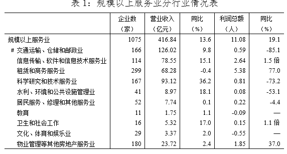 从行业看,主要行业门类表现为“三升一降”格局,其中科学研究和技术服务业完成营业收入93.12亿元,同比增长36.2%,增幅领先;信息传输、软件和信息技术服务业完成营业收入78.55亿元,同比增长15.1%,发展较快;交通运输、仓储和邮政业完成营业收入126.02亿元,同比增长9.8%,稳中有升;租赁和商务服务业完成营业收入68.28亿元,同比下降0.4%,但降幅较上月收窄2.4个百分点。此外,水利、环境和公共设施管理业与卫生和社会工作也增长较快,同比分别增长18.1%和17.0%(见表1)。