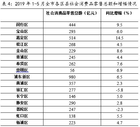 2019年1-5月,上海市社会消费品零售总额同比增幅为7.1%。其中浦东新区、嘉定区和闵行区社会消费品零售总额总量分列前三,嘉定区、闵行区和金山区社会消费品零售总额同比增幅位居前三。