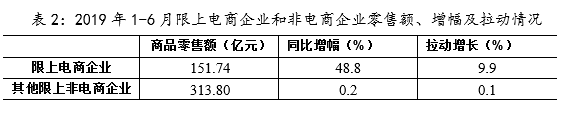 2019年1-6月,全区限上涉及互联网电商的零售企业共计实现零售额151.74亿元,同比增长了48.8%,拉动全区社会消费品零售总额增长了9.9个百分点。而未开展互联网电商的其他限上企业实现零售额313.80亿元,同比仅增长0.2%。互联网电商企业对全区社会消费品零售总额增幅的拉动作用非常明显。
