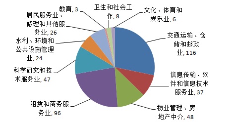 1.企业数量同比显著增加。上半年,全区规模以上服务业企业411家,较去年同期增加71家。其中,交通运输、仓储和邮政业,租赁和商务服务业这两个行业企业数量最多,分别为116家和96家,占全区规模以上服务业数量比重分别为28.2%和23.4%;企业数量同比增加最多的是交通运输、仓储和邮政业,租赁和商务服务业,物业、房产中介行业,较上年同期分别增加了24家、14家和14家(见图1)。