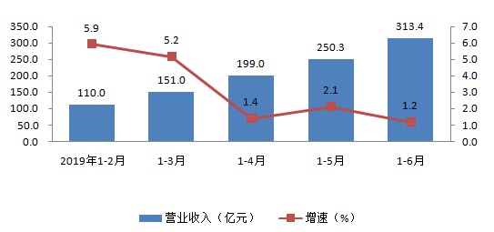 2.营业收入增速放缓。今年以来,全区规模以上服务业受大企业增速下滑影响,走势呈下降态势,企业营业收入增速放缓。上半年,全区规模以上服务业企业实现营业收入313.4亿元,同比增长1.2%,增速较1-5月下降了0.9个百分点,较上年同期相比下降了6.3个百分点(见图2)。