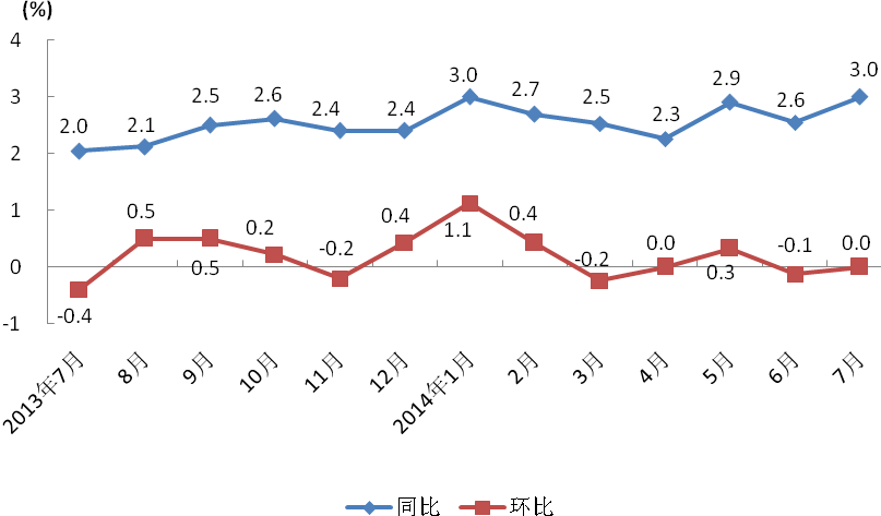附图:2013年7月-2014年7月上海居民消费价格同、环比升幅走势