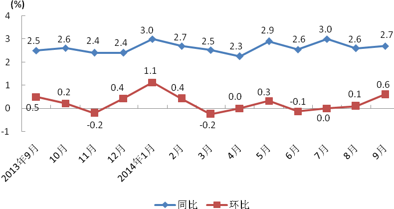 附图:2013年9月-2014年9月上海居民消费价格同、环比升幅走势