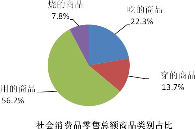 分商品类别看,1-11月吃、穿、用、烧类商品零售额分别为1774.95亿元、1094.13亿元、4472.56亿元和617.81亿元,分别增长5.2%、14.6%、9.5%和3.9%,分别占社会消费品零售总额的22.3%、13.7%、56.2%、7.8%。
