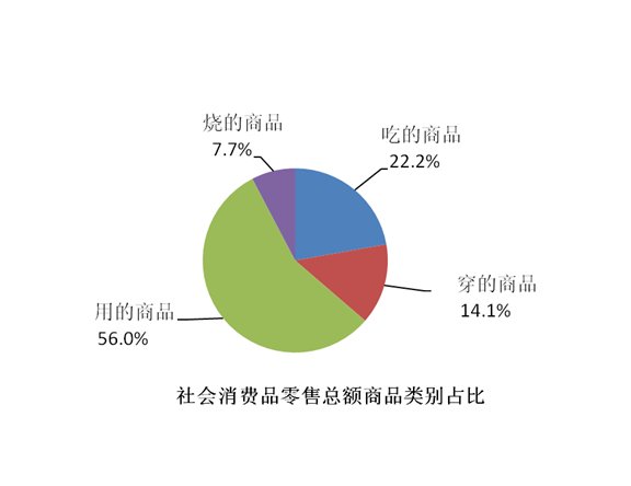 分商品类别看,吃、穿、用、烧类商品零售额分别为1935.71亿元、1230.51亿元、4882.57亿元和669.86亿元,分别增长5.3%、14.4%、9.6%和2.9%,分别占社会消费品零售总额的22.2%、14.1%、56.0%、7.7%。