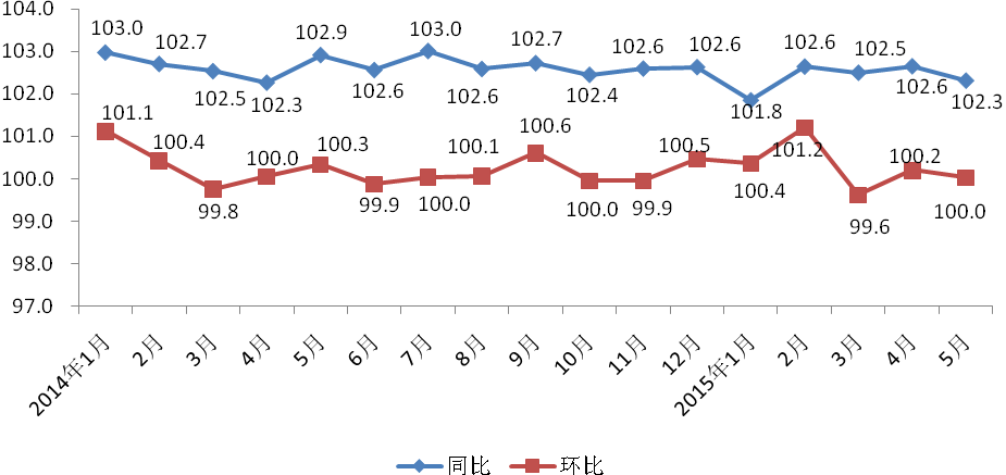 附图:2014年1月-2015年5月上海居民消费价格同、环比