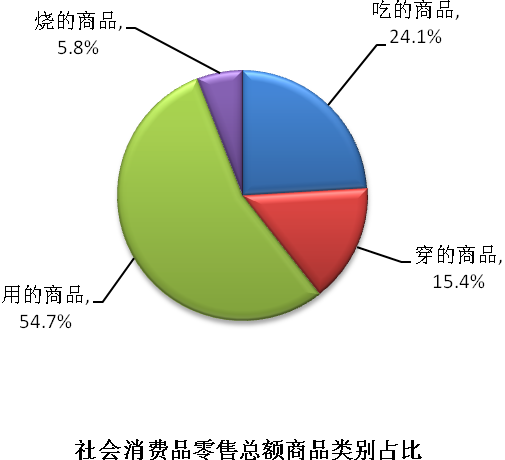 分商品类别看,1-5月吃、穿、用、烧的商品零售额分别为963.91亿元、615.88亿元、2192.73亿元、233.94亿元,分别占社会消费品零售总额的24.1%、15.4%、54.7%、5.8%。其中吃、穿、用的商品分别增长4.6%、7.3%和12.5%,烧的商品下降12.1%。
