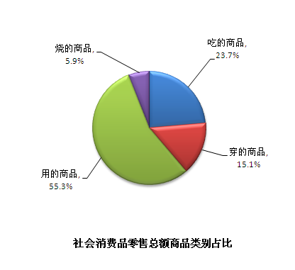 分商品类别看,上半年吃、穿、用、烧的商品零售额分别为1143.17亿元、730.77亿元、2673.44亿元和285.54亿元,其中吃、穿、用的商品分别增长4.6%、7.7%和13.0%,烧的商品下降12.7%,分别占社会消费品零售总额的23.7%、15.1%、55.3%、5.9%。