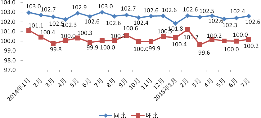 附图:2014年1月-2015年7月上海居民消费价格同、环比