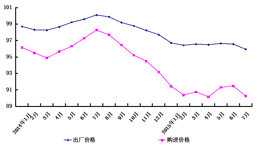 2015-08-19 来源:国家统计局上海调查总队7月份,本市工业生产者出厂价格总水平比去年同期下降4.1%,降幅比上月扩大0.7个百分点;购进价格总水平比去年同期下降9.7%,降幅比上月扩大1.2个百分点(见图1)。