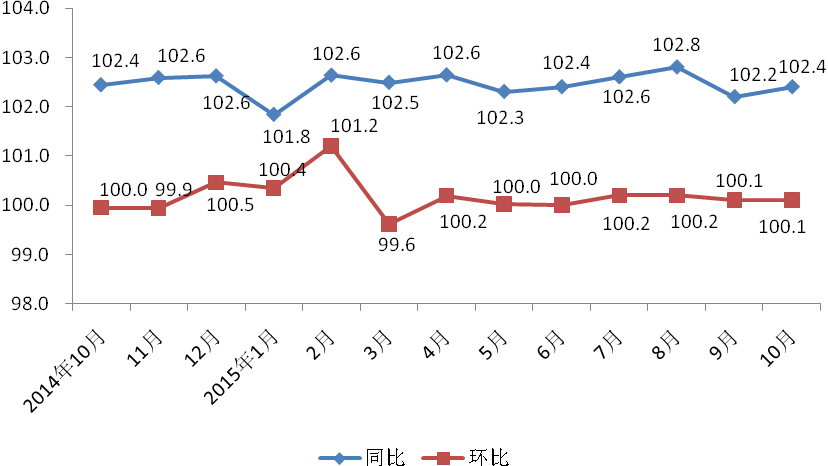 附图:2014年10月-2015年10月上海居民消费价格同、环比