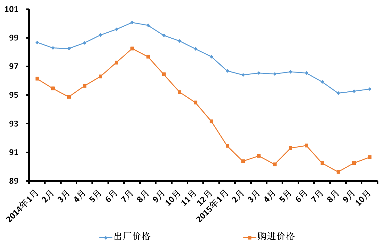 2015-11-19 来源:国家统计局上海调查总队10月份,本市工业生产者出厂价格总水平比去年同期下降4.6%,降幅比上月收窄0.1个百分点;购进价格总水平比去年同期下降9.3%,降幅比上月收窄0.5个百分点(见下图)。